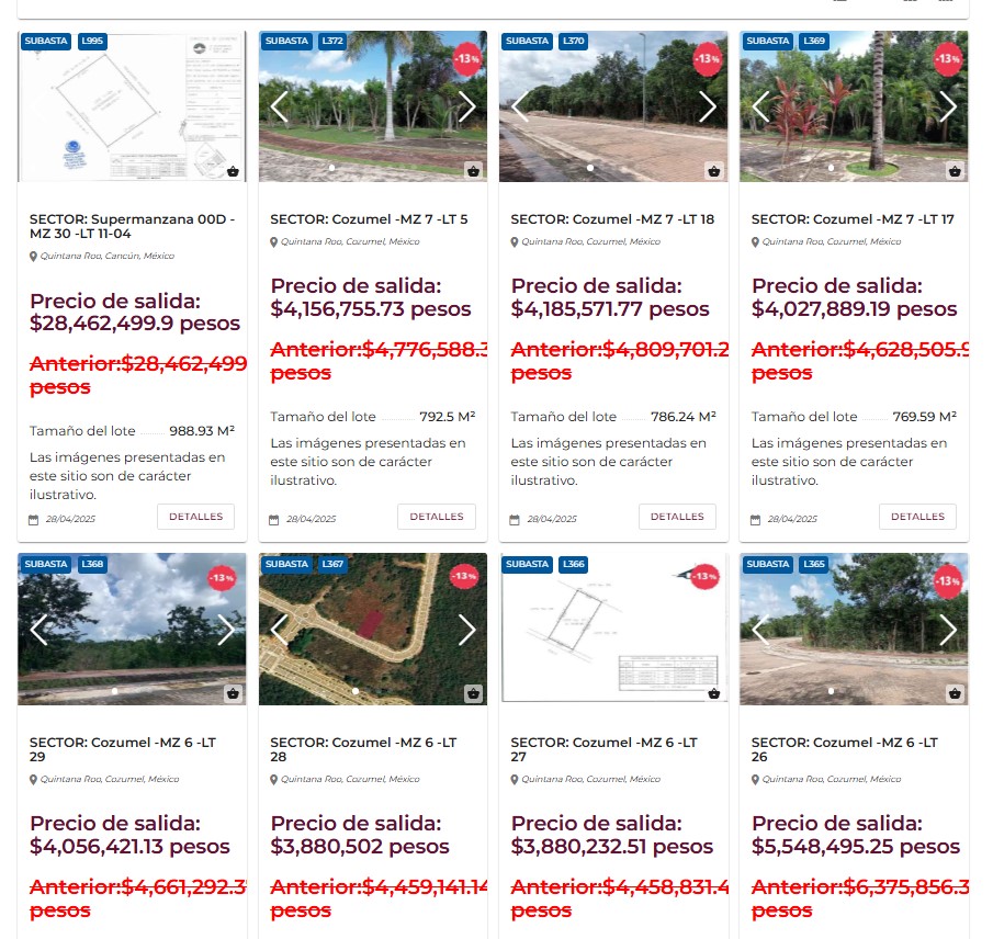 En Cancún se incluían 13 lotes ubicados en Lomas de Vista Hermosa y la Supermanzana 10, con uso de suelo multifamiliar, características ideales para el desarrollo de torres habitacionales de alto nivel, con vistas privilegiadas a la Laguna Nichupté y cercanía con la zona hotelera. Algunos de estos predios tenían precios de salida de hasta 73 millones de pesos por unidad.