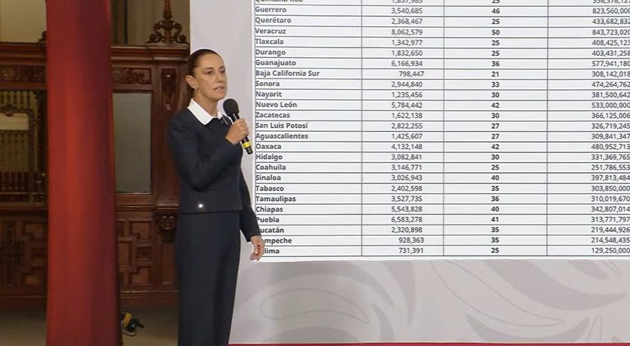 Durante la exposición, Sheinbaum mostró una tabla con los presupuestos de los congresos de cada estado, el número de diputados y el costo promedio por legislador.