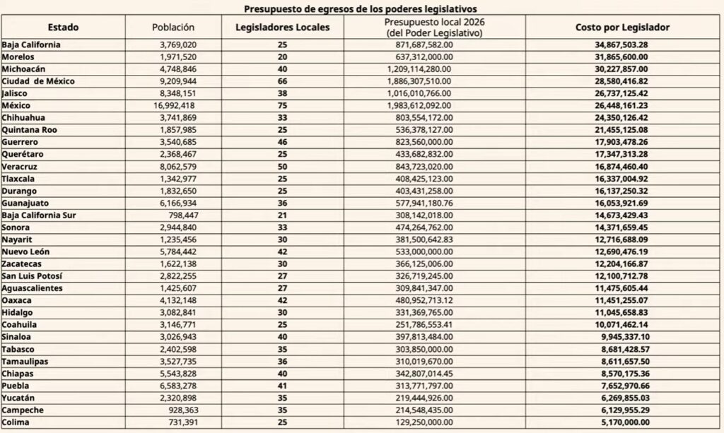 El ranking es encabezado por Baja California, con un costo cercano a 34 millones de pesos por diputado, seguido por Morelos, Michoacán, Ciudad de México y Jalisco.