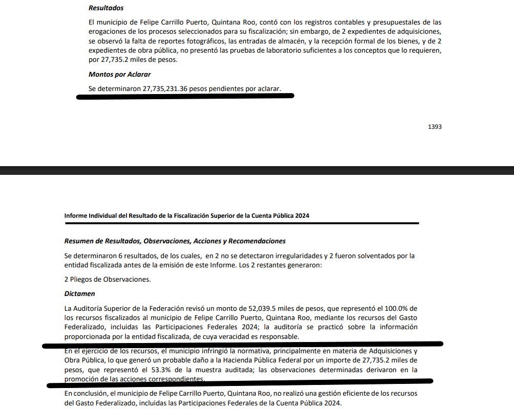 FELIPE CARRILLO PUERTO.- La Auditoría Superior de la Federación (ASF) determinó presuntos daños a la Hacienda Pública federal en el municipio de Felipe Carrillo Puerto, correspondientes al ejercicio 2024, por un monto superior a 27 millones de pesos observados en compras y obras públicas ejecutadas con recursos federales durante la administración de la alcaldesa Maricarmen Hernández Solís.