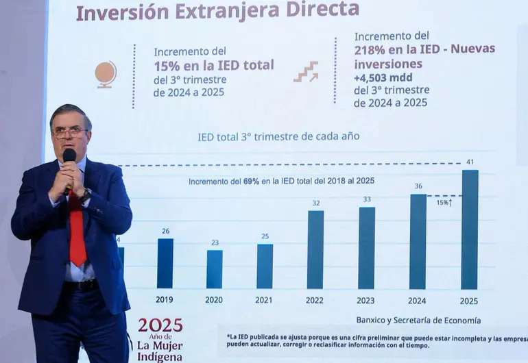 CIUDAD DE MÉXICO.- En presencia de la presidenta de México, Claudia Sheinbaum Pardo, el secretario de Economía, Marcelo Ebrard Casaubón, anunció este miércoles 19 de noviembre que México tendrá récord histórico en Inversión Extranjera Directa (IED).