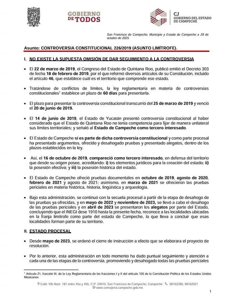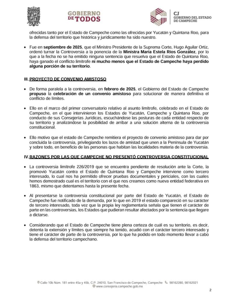 En un comunicado emitido por la Consejería Jurídica del Gobierno de Campeche, del que es titular Adrián Serrano Barrientos, la entidad vecina afirmó que, contrario a lo dicho por su homólogo quintanarroense, Campeche si es parte de la controversia constitucional de límites, porque está reconocida por la Corte como tercero interesado en la demanda que puso el estado de Yucatán, por lo que no tuvo la necesidad de presentar una demanda propia, y en esa calidad ya presentó sus pruebas, peritajes y alegatos, al igual que Yucatán y Quintana Roo.