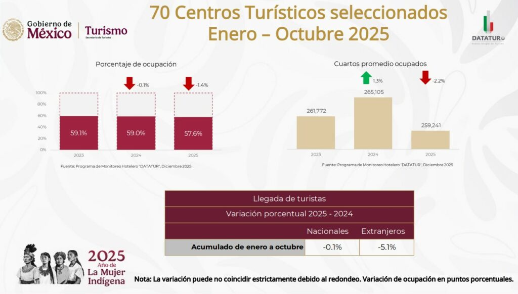 El monitoreo señala que hay disminución de 1.4 % de ocupación hotelera en estos destinos y baja de 2.2 % de cuartos promedio ocupados entre enero y octubre de 2025, relacionada con la disminución de llegadas del 5.1 % de turistas extranjeros y de 0.1 % de turistas nacionales respecto al 2024 a esos destinos.