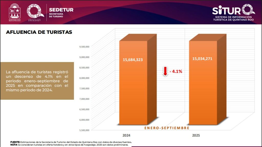 En su último informe ¿Cómo vamos en turismo?, reporta que en el periodo enero-septiembre de 2025 se observa un descenso de 4.1 % en la afluencia turística en comparación con el mismo periodo de 2024, con la llegada de 15 millones 34 mil 271 turistas al Caribe Mexicano, de los cuales sólo el 29 % son turistas extranjeros llegados por vía aérea.