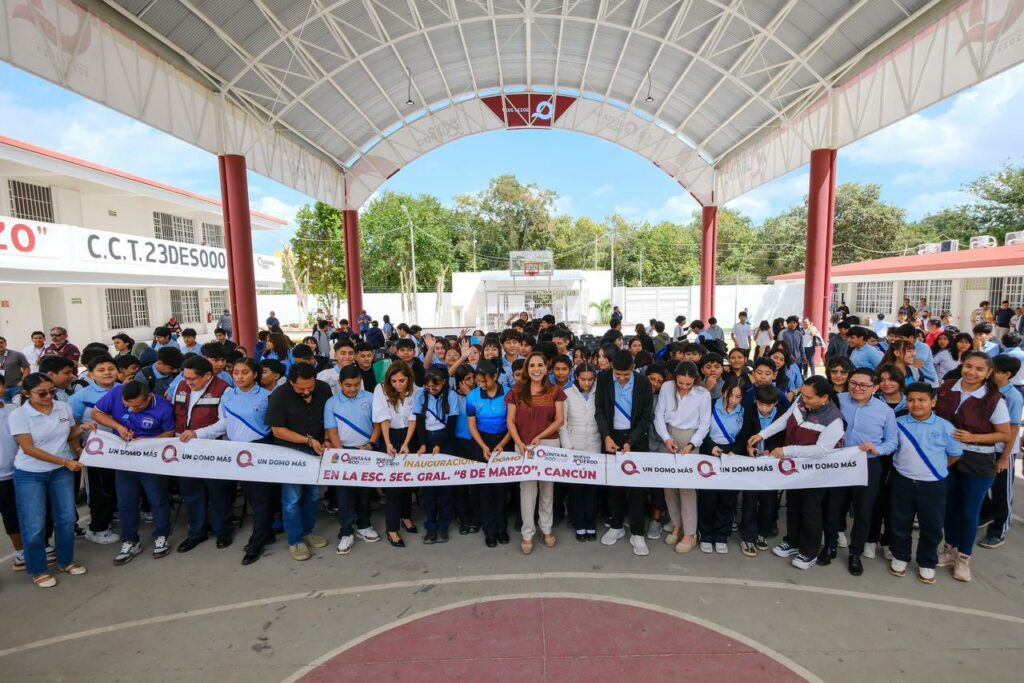 CANCÚN.- Alumnas y alumnos de la escuela secundaria general “8 de Marzo” de Cancún recibieron hoy de la gobernadora Mara Lezama Espinosa el nuevo domo recién construido y que fue solicitado durante una visita anterior, y cuyo compromiso cumplió, como lo hizo anteriormente con la rehabilitación de aulas.