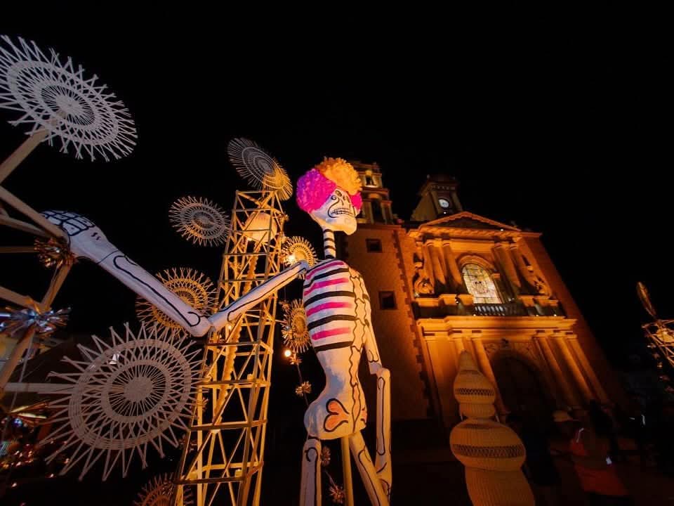 Cempasúchil, el fuerte amarillo del partido naranja por el que dicen que también apuesta el Alcalde guinda como alternativa, satura la plaza central en un tumulto de islotes de diverso diseño conmemorativo. Osamentas y calaveras blancas y multicolores de todos los tamaños reinan en el paraíso festivo de la muerte. En la enorme fuente del “pueblo mágico” sonríe, sardónico y monumental, un esqueleto que se eleva por encima de todo. El quiosco de cantera es un robusto altar frente a la iglesia iluminada con el tenue alumbrado de la ocasión, que contrasta con el resplandor de las luces multitudinarias de las velas y las veladoras simuladas y esparcidas por el panteón incandescente en que se ha convertido la plaza de este pueblo de quinientos años y reconstruida hace unos veinte o más, para el mercado del turismo, con perfiles coloniales. Y al pie del laico altar oficia el joven Alcalde, y en vez de hostias de trigo reparte pan de muerto y en vez de alzar y de beber el vino de consagrar reparte chocolate y en vez de comunión y fe de santidad sus sonrientes gestos piden a la fila de devotos de los milagros evangélicos de la casa de Jesús de enfrente y asimismo potenciales electores, sufragios, sufragios, sí señor, boletas cruzadas en las urnas a su nombre para cuando llegue la hora de la hora de votar, después de la misa del domingo de la resurrección de las almas de entonces con el alimento del cuerpo de Cristo, por la reelección del Alcalde que sigue allí, al pie de su inversión municipal y con su chaleco guinda, repartiendo los panes del cuerpo de la regeneración moral.