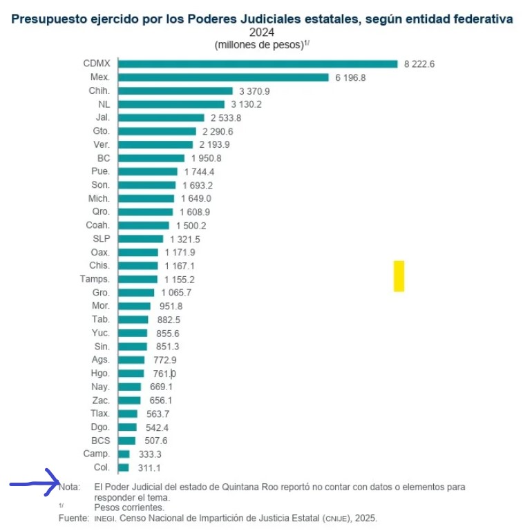 Posteriormente a esa publicación, el Poder Judicial del Estado entregó la información y el Inegi modificó la gráfica, por lo que en la versión pública actualizada del CNIJE ya aparece Quintana Roo, con el dato de 891.2 millones de pesos de presupuesto ejercido en el 2024.