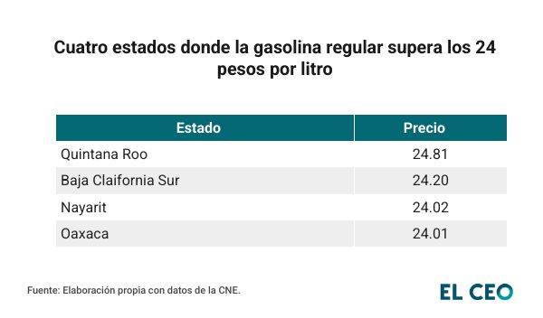 En gasolina regular, Quintana Roo encabeza la lista nacional con un precio promedio de 24.81 pesos por litro. Le siguen Baja California Sur, con 24.20 pesos, y Nayarit, con 24.02 pesos por litro.