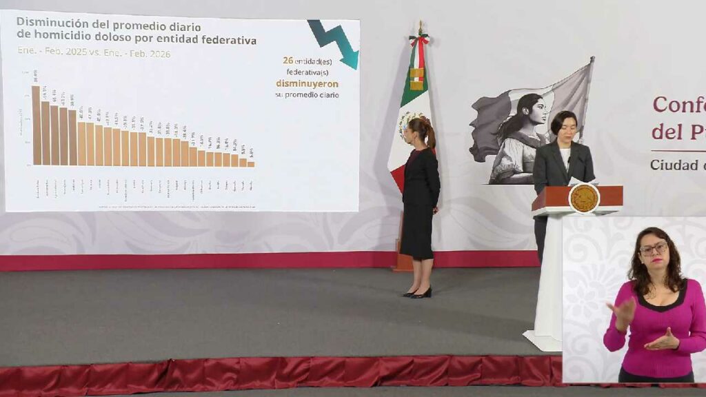 CIUDAD DE MÉXICO.- Quintana Roo avanzó del tercer al segundo lugar nacional en reducción del promedio diario de homicidios dolosos al cierre de febrero de 2026, informó la titular del Secretariado Ejecutivo del Sistema Nacional de Seguridad Pública, Marcela Figueroa, durante la llamada Conferencia del Pueblo.
