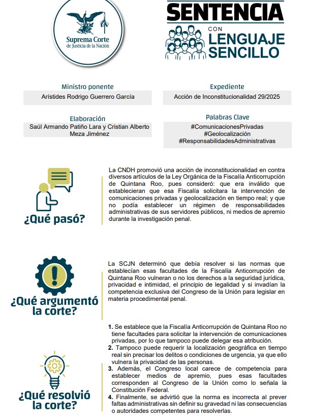 CIUDAD DE MÉXICO.- Por mayoría y votación dividida, la “nueva” Suprema Corte de Justicia de la Nación (SCJN) resolvió que la Fiscalía Anticorrupción de Quintana Roo no puede intervenir comunicaciones privadas ni solicitar la localización geográfica en tiempo real de personas, como se pretendía hacer, porque son medidas que violan el derecho a la privacidad.