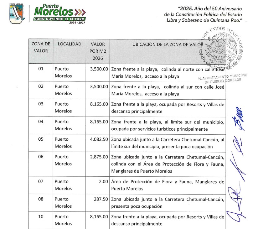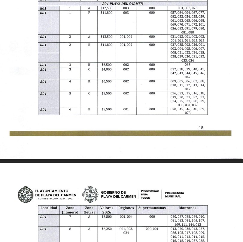 Dice que corrige más de una década de rezago, colocando valores comerciales actuales 12 años después de la última autorización, por lo que contempla valores máximos de hasta 12 mil 500, 11 mil 800 pesos y 10 mil pesos por metro cuadrado en las zonas turísticas 1 A, 1 F y 18 H de Playa del Carmen, respectivamente, así como de hasta 10 mil, 6 mil 500 y 5 mil pesos por metro cuadrado para predios rústicos de la zona 24 A Manzana 21, zona 5 A manzana 60 y zona 4 C del municipio, respectivamente.