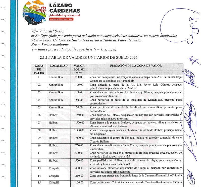 Por su parte, la iniciativa de Tabla de Valores Unitarios de Suelo y Construcción de Lázaro Cárdenas, presentada por el alcalde Josué Nivardo Mena Villanueva, contempla valores del suelo para Kantunilkín que van de 50 a 200 pesos por metro cuadrado de la periferia al centro de la cabecera municipal, y de 500 a 1 mil 500 pesos por metro cuadrado en la isla de Holbox de la periferia a la playa, con ajustes en todas las demás localidades del municipio.